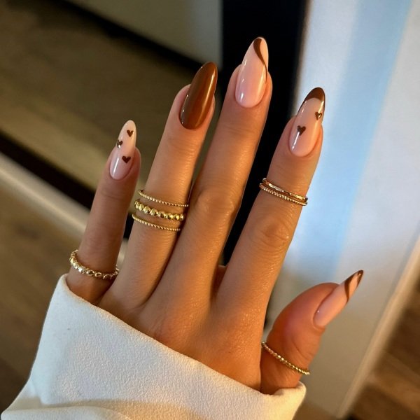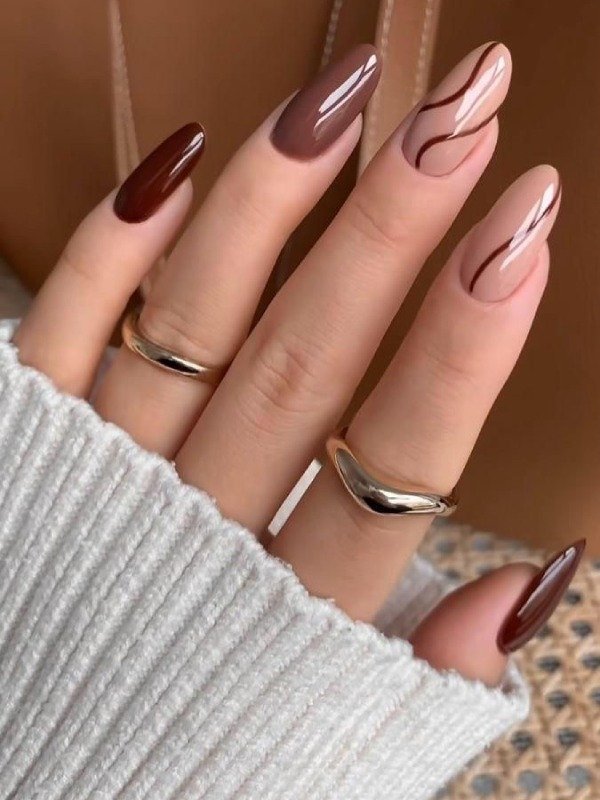 Stiletto shape nails have become popular since late thanks to pop culture. The nail features two nails with patterns, one ombre brown, and one full brown as well.