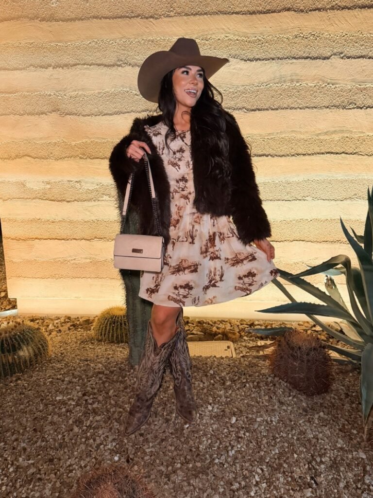 A faux jacket layered over a sundress is great for a cooler evening event or outdoor concerts. The earthy tone complements the western aesthetic while keeping your outfit cozy and stylish. Complete the look with cowboy boots and a brown hat for a nice country vibe.