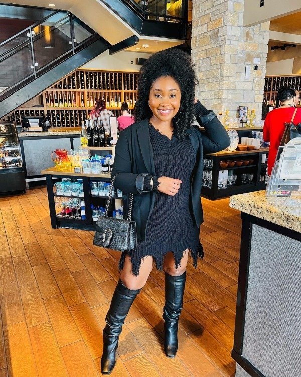 An all-black sweater dress offers comfort and effortless style for cooler concert nights. Adding a black blazer elevates the look while keeping it warm and structured. Complete the outfit with boots for a fall concert inspired look.