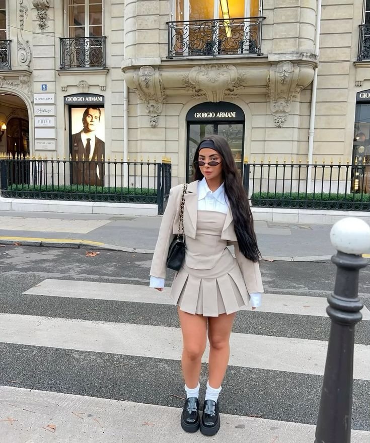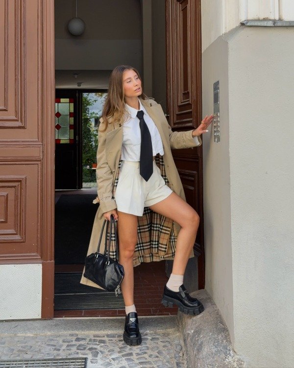 Dress Shorts are becoming a staple piece for most women’s wardrobes, especially Gen Z ladies. This look features an elegant, well-dressed look but with a schoolgirl flair.
