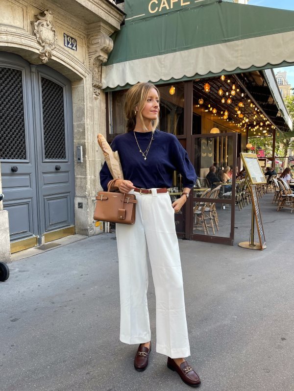 This look is easy to recreate, and it’s casual but intentional. So if you want something to run errands but still look sophisticate,d try adding a jersey, wide leg pants, and loafers.