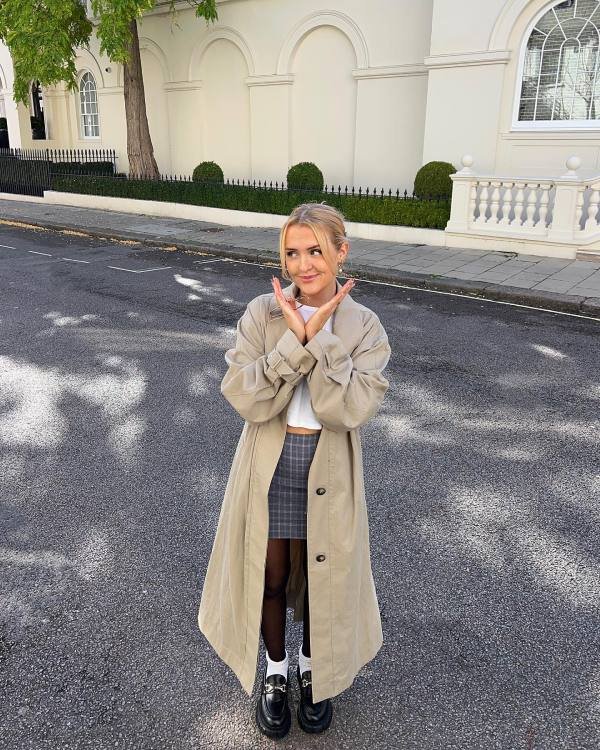 Trenchcoat + Mini chequered skirt+