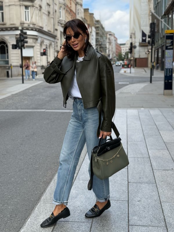 This is a cool look with a leather jacket and Gucci brand loafers that is both luxurious and casual in style. The olive green jacket goes perfectly with the handbag and jeans combo. The look is mature and a fall style for women over 40.