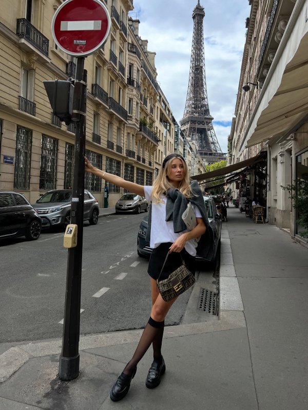 This is such a European look, we love the casual preppy casual style combo. This is a good way to show off your loafers, light under the knee socks, and a Fendi brown bag, simple white tee shirt, and sweater in case the time gets chilly.