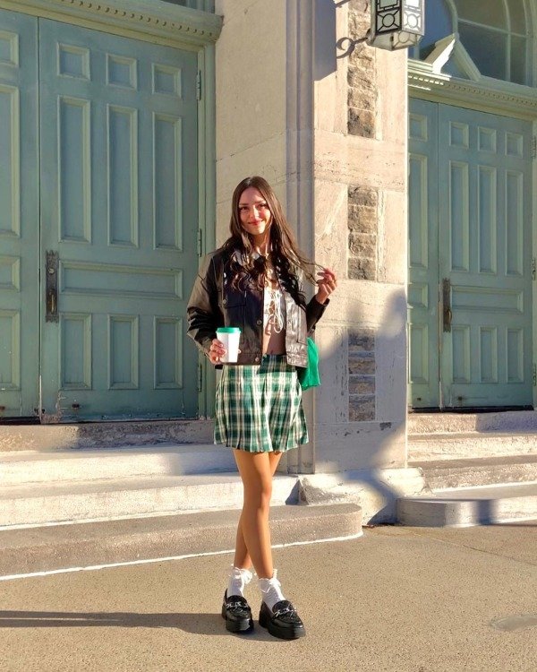 Green Plaid Skirt + Brown Jacket