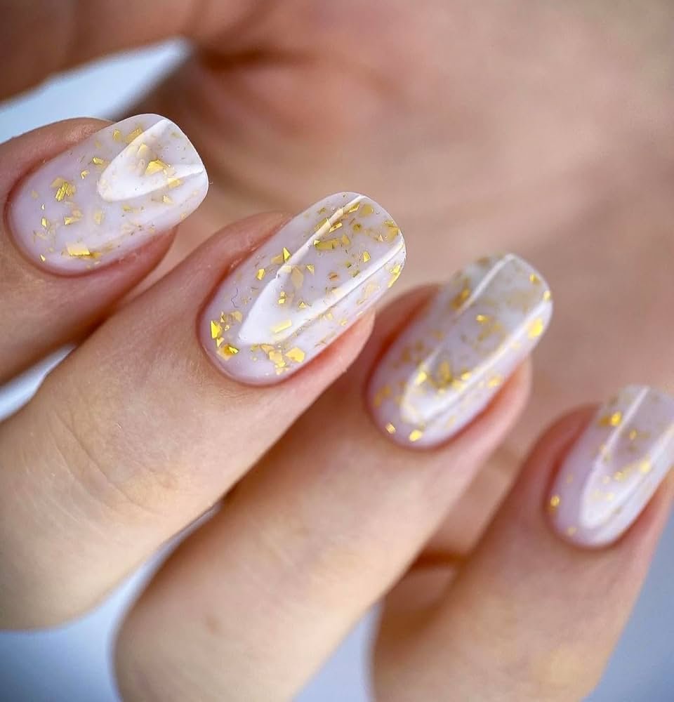 These white press-on nails are accented with beautiful gold flecks that catch the light with each movement. The pristine white base produces a clean canvas, while the dispersed gold embellishments add the perfect amount of glitter.