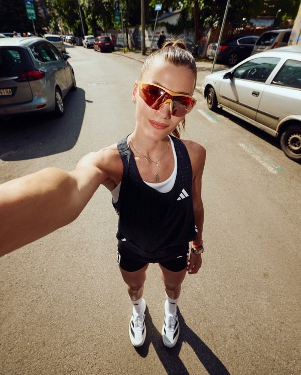 Adidas is known for athleisure wear, black tank tops and black running shorts, and black and white running shoes. The sunglasses help to keep the sun out of your eyes when you are on the go.