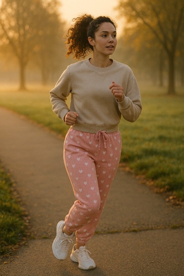 Joggers are a popular choice, especially the early morning or later evening. These are not only cozy, but they are great for sweat, and the small hearts on this one are cute.
