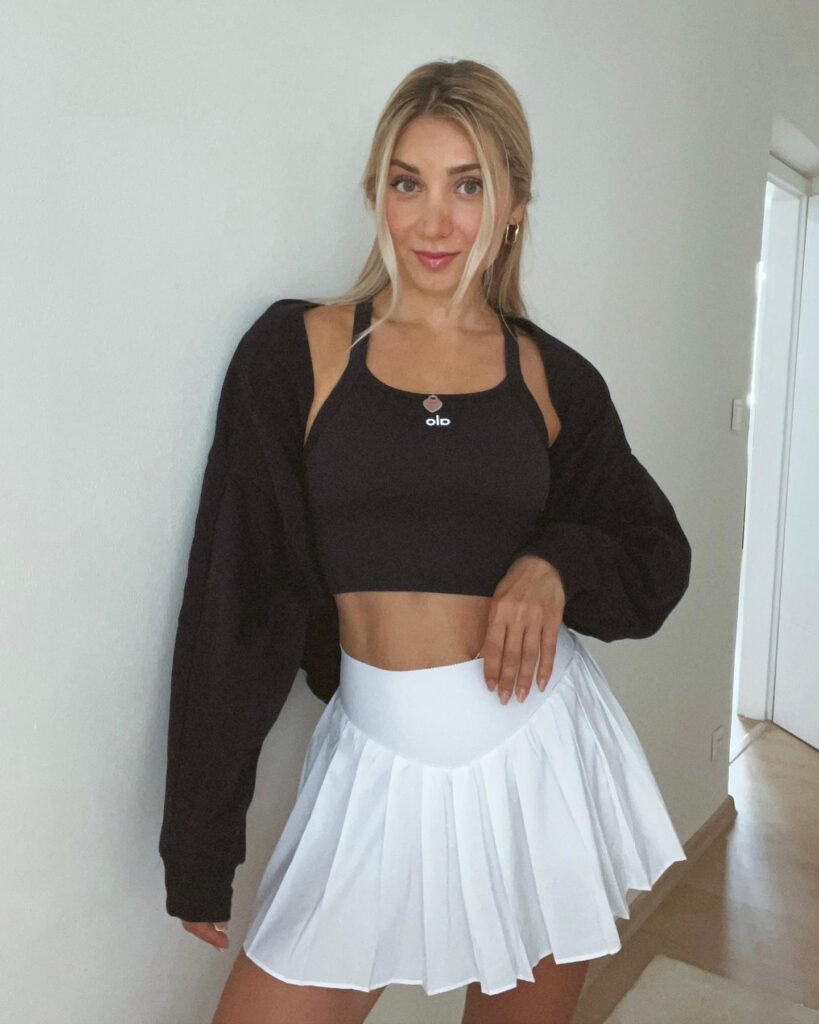 You can choose to go running in a tennis/ sporty skirt as well. This look is one of my personal favorites because I can multitask wearing something cute but still functional.