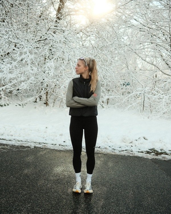 Puffer vests are a winter essential, and they work well when going for a run too. A proper fit outfit is a good lightweight jacket, you can add gloves for really cold days, and the long sleeve blouse is good.