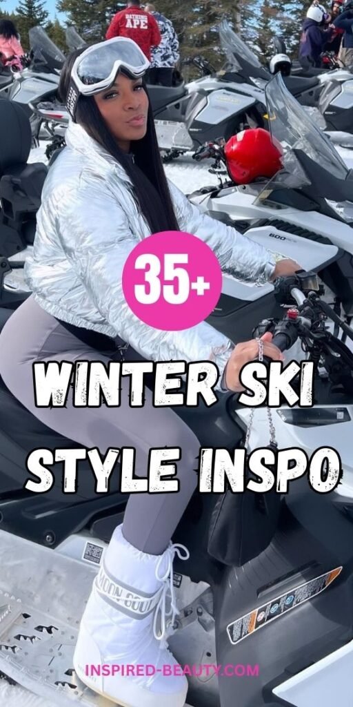 If you are looking for something that stands out on Instagram. This is a cool outfit inspo with a chromed trendy jacket and a white outfit that reflects well with the snow.