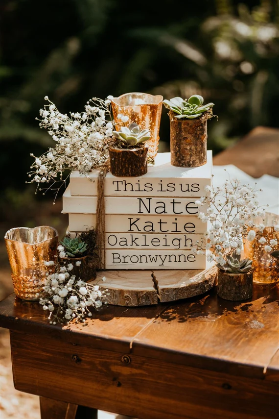 Vintage books stacked as centerpieces