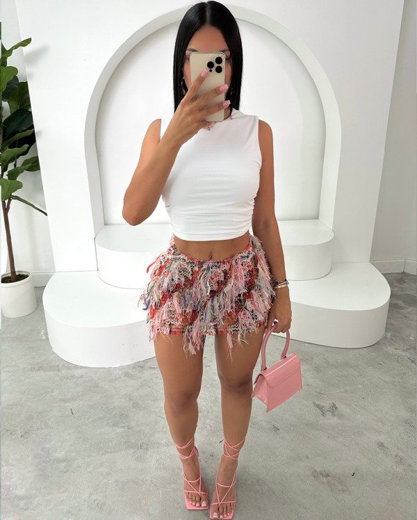 This look is ready for a party, and the skirt gives movement,t which is great if you want to dance. The skirt is giving drama, cute, and a cropped top showing more skin because it’s summer.